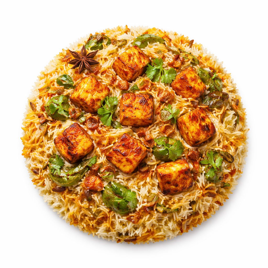 Smoky paneer tikka pieces combined with saffron rice and spices for a bold and flavorful vegetarian delight.