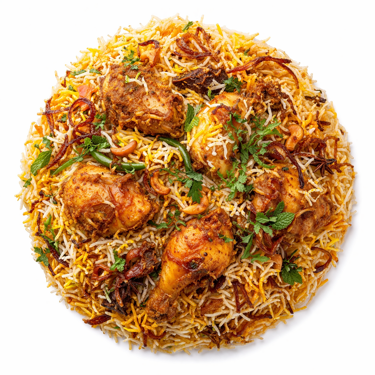 A signature Kolkata delicacy featuring fragrant rice, tender chicken, golden potatoes, and boiled egg with subtle spices.